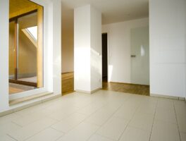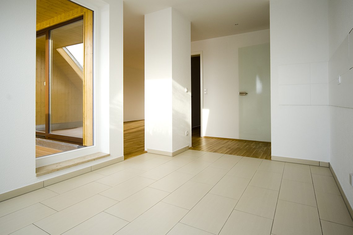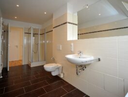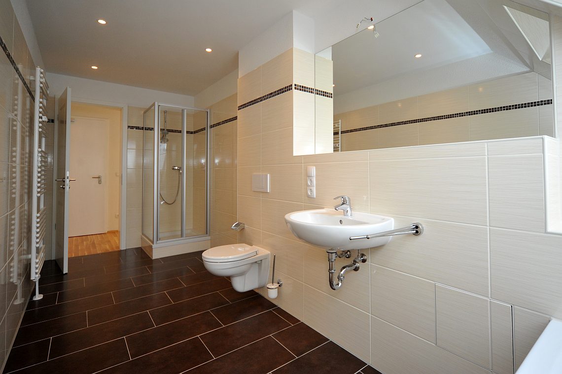 Die SABA Bau realisierte in Leipzigs Arno-Nitzsche-Straße ein Objekt mit Eigentumswohnungen der gehobenen Mittelklasse. Wir kümmerten uns um das Thema Fliesen und verlegten etwa 800 Quadratmeter. Die großen Fliesenplatten von 30 mal 60 Zentimetern unterstützen den luftigen Raumeindruck. Beigetöne kontrastieren mit Braun. Ein mosaikartiger Streifen gibt dem Raum eine zusätzliche Struktur. Wichtig war unter anderem, einen glatten Übergang zwischen Fliesen und Parkett zu erreichen. Wir lieferten und montierten auch die großen Spiegel.